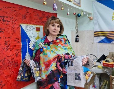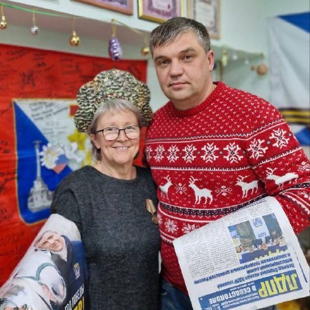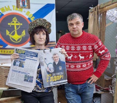 Координатор первичного отделения «Корабел» Юрий Дубков распространяет новогодний выпуск газеты ЛДПР среди волонтеров общественной организации ВОИНЫ-Z.