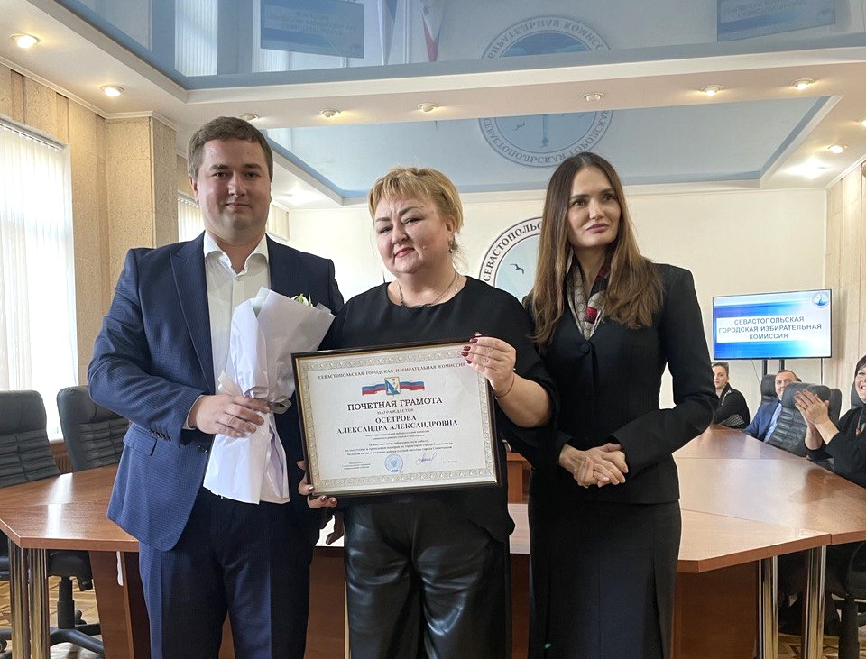 Вручая поощрения, председатель Севастопольской городской избирательной комиссии Нина Фаустова поблагодарила Александру Осетрову за профессионализм, ответственность, добросовестный труд и преданность делу, отметив высокий уровень вовлеченности и надежность в работе.